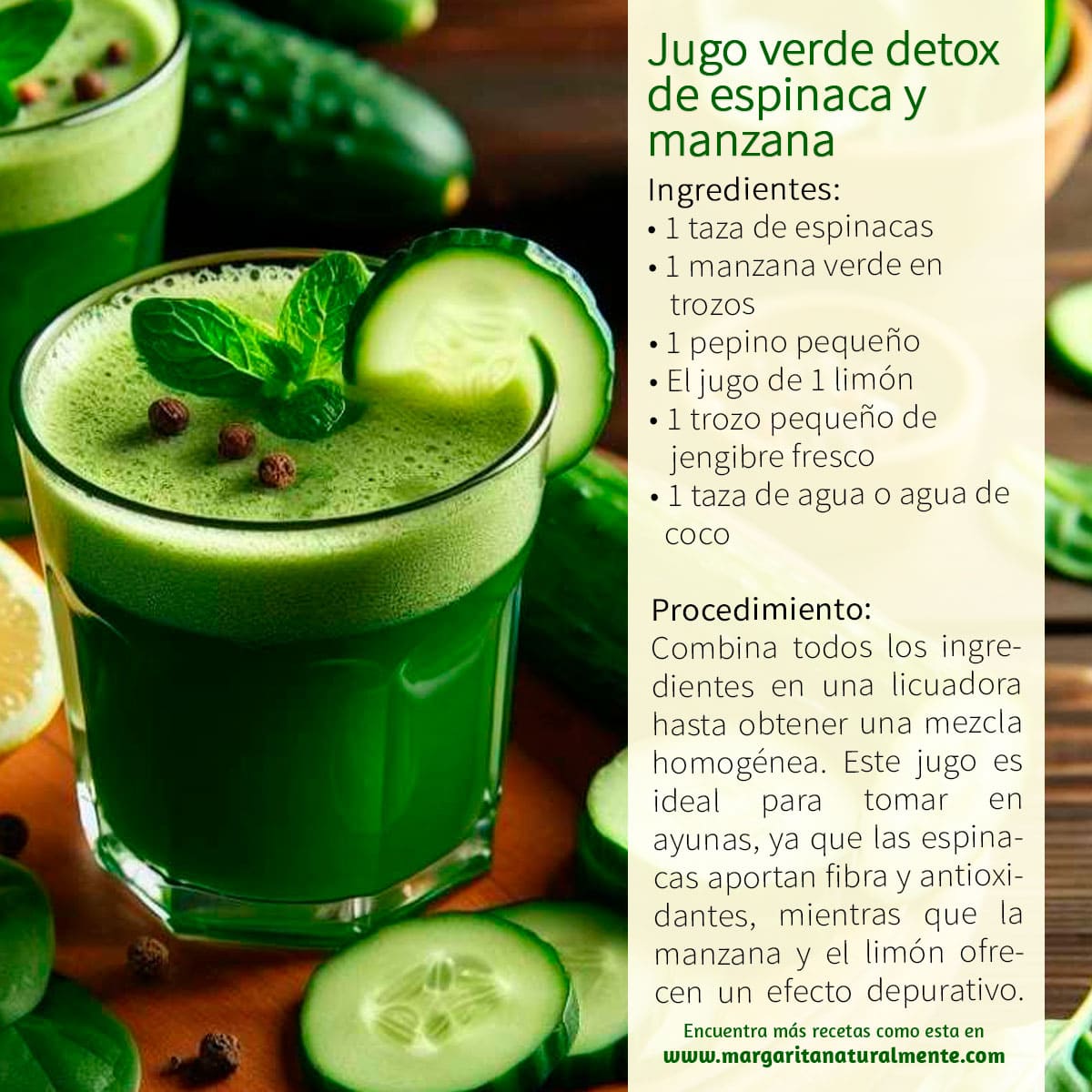 • Este jugo es ideal para tomar en ayunas, ya que las espinacas aportan fibra y antioxidantes, mientras que la manzana y el limón ofrecen un efecto depurativo.